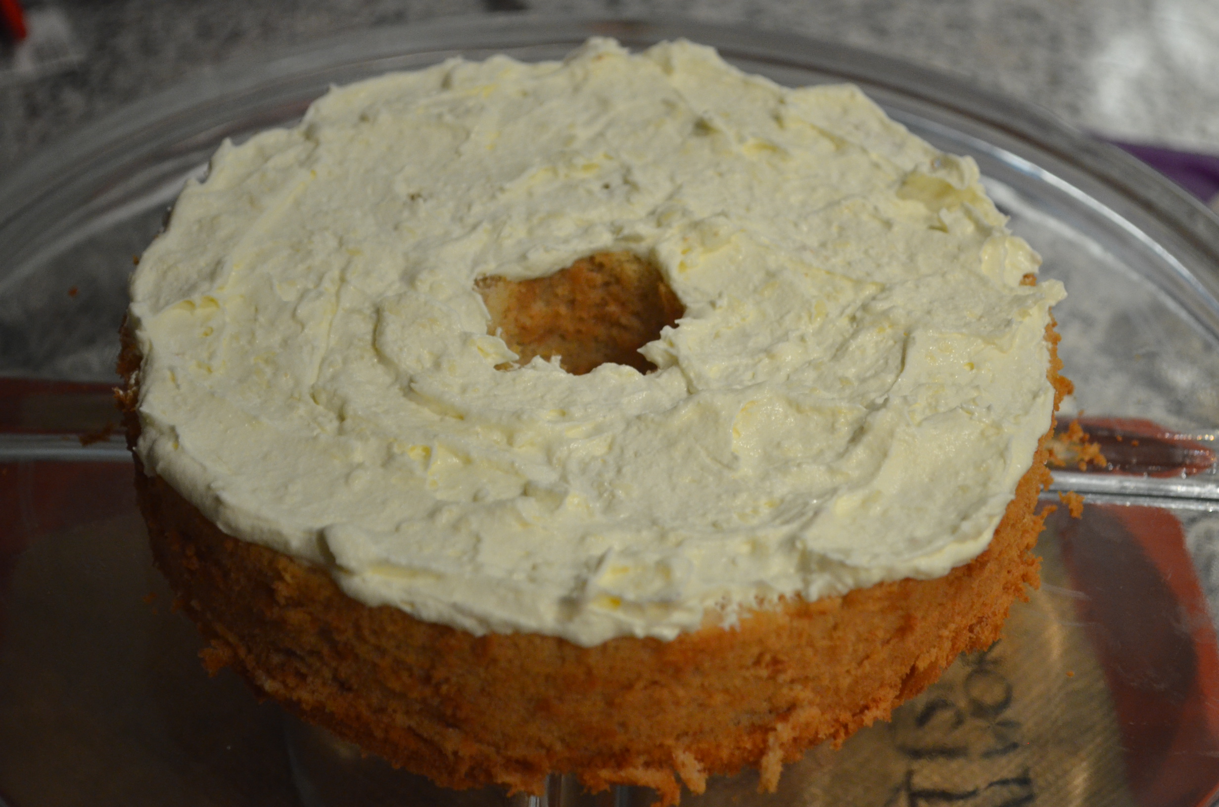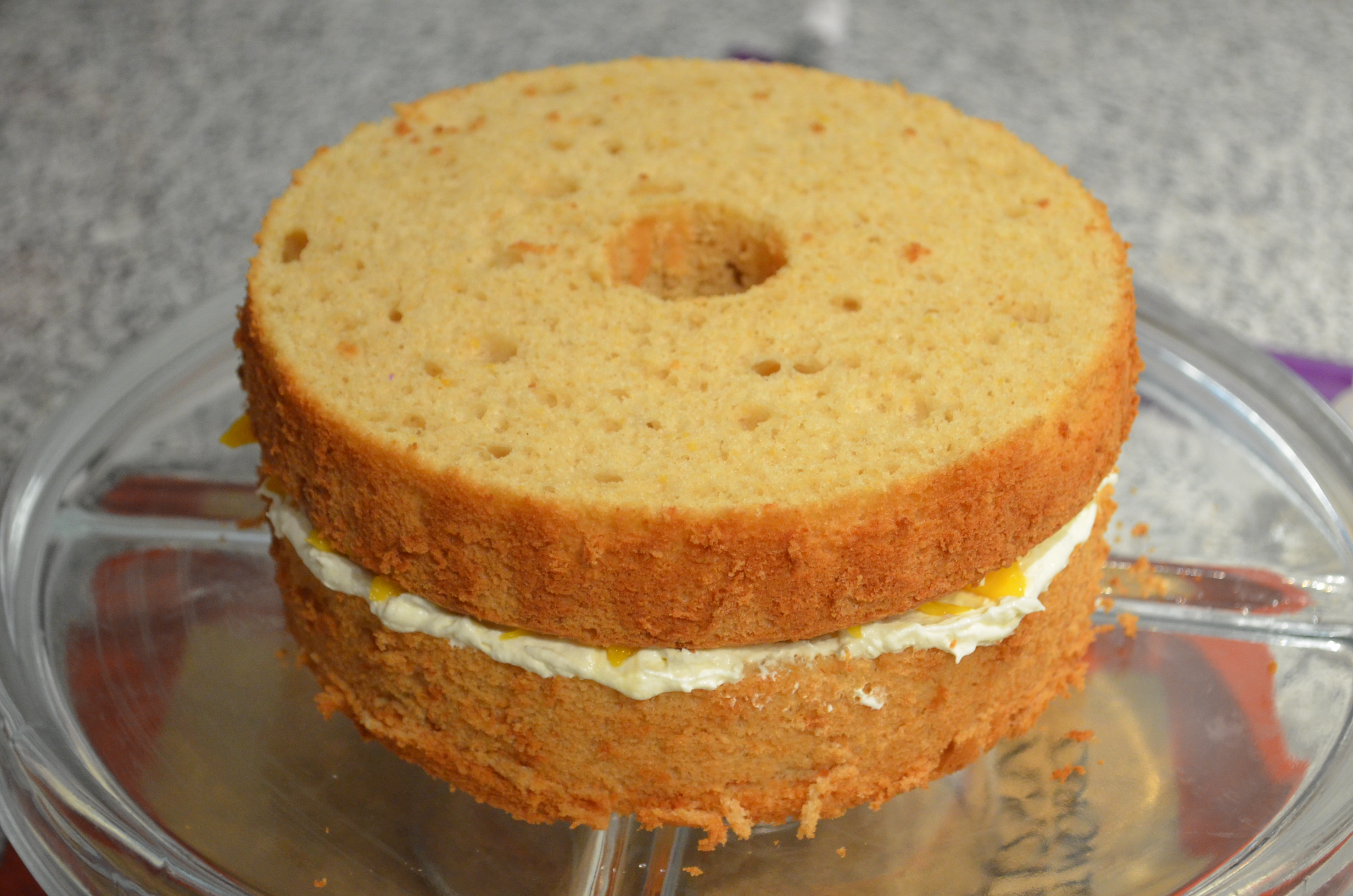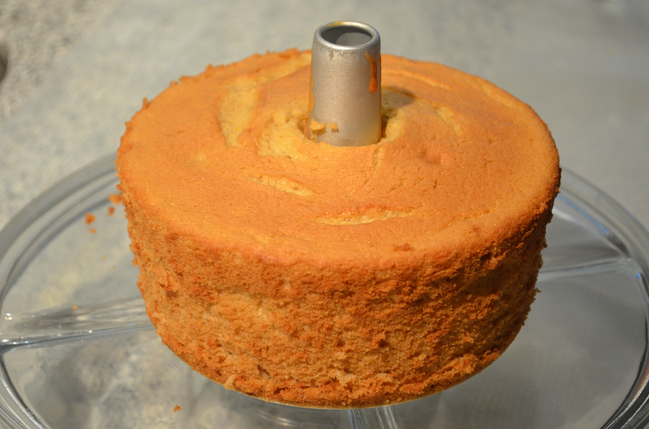 - Pour into a 6″ tube pan or round pan (do NOT grease). Tap 3-4 times on the counter top to release the bubbles.