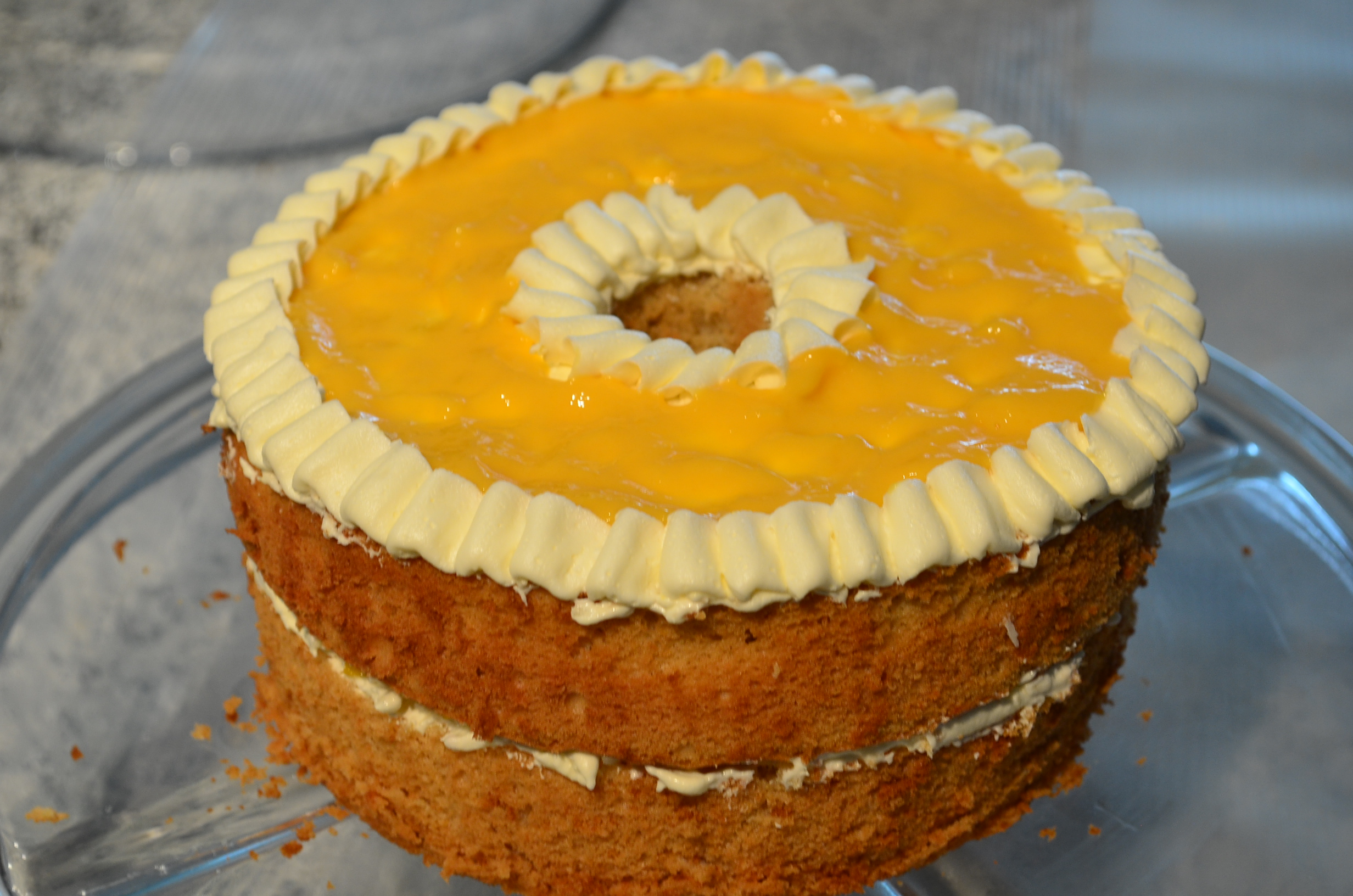 - Decorate as desired: Select desired frosting. I recommend a simple vanilla whipped cream and coconut buttercream frosting. This works best with Mango. Cut the cake into half (or into 3). Spread frosting on top of each. Top with thinly sliced mangoes. Cover the top and finale layer with frosting and pipe more frosting on the side to act as border. Gradually add mango puree on top of the cake. Add diced mangoes. Drizzle with honey. Decorate with more whipped cream in the center.