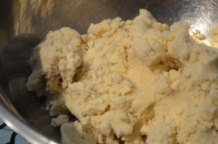Once it start to form a dough, divide and roll in a floured surface. Chill 30 min to 1 hr before transferring into a pie pan