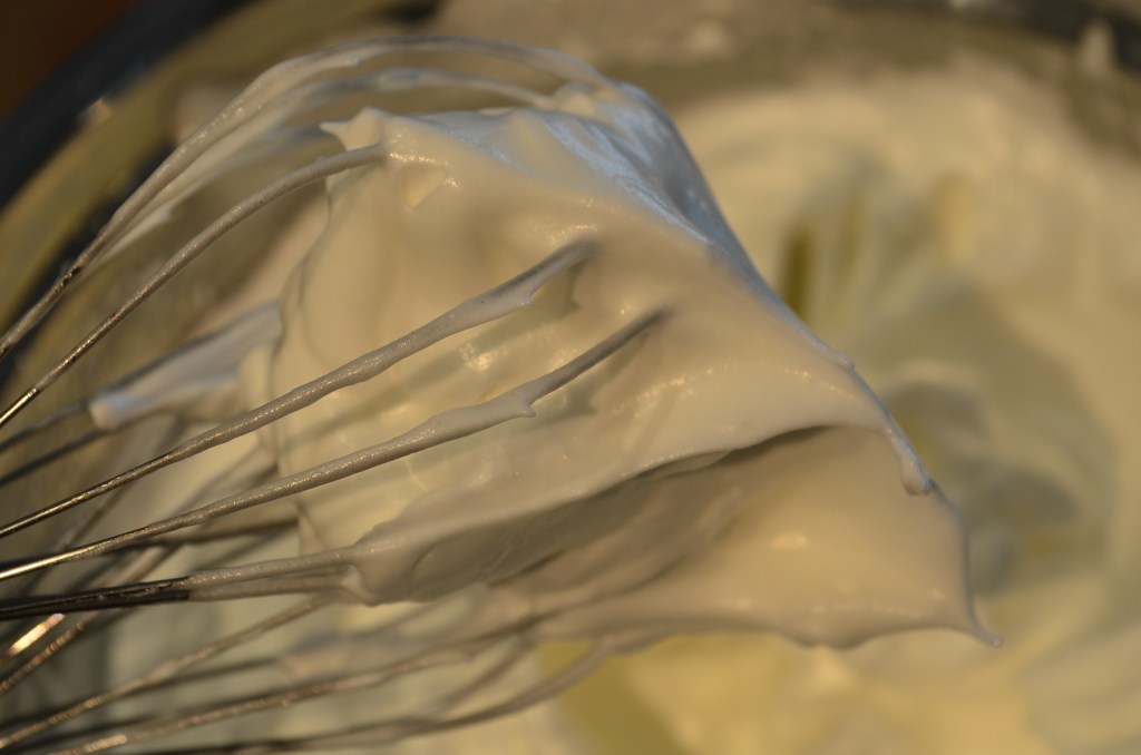 6. Place the egg whites and cream of tartar in a clean bowl of your electric mixer, fitted with the whisk attachment (can also use a hand mixer), and beat until soft peaks form. Gradually sprinkle in the remaining sugar and continue to beat until stiff peaks form. Fold about 1/4 of the whites into the chocolate batter to lighten it. Quickly fold in the rest of the whites and mix only until incorporated.