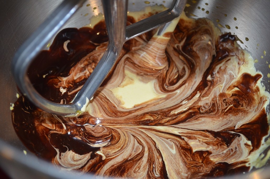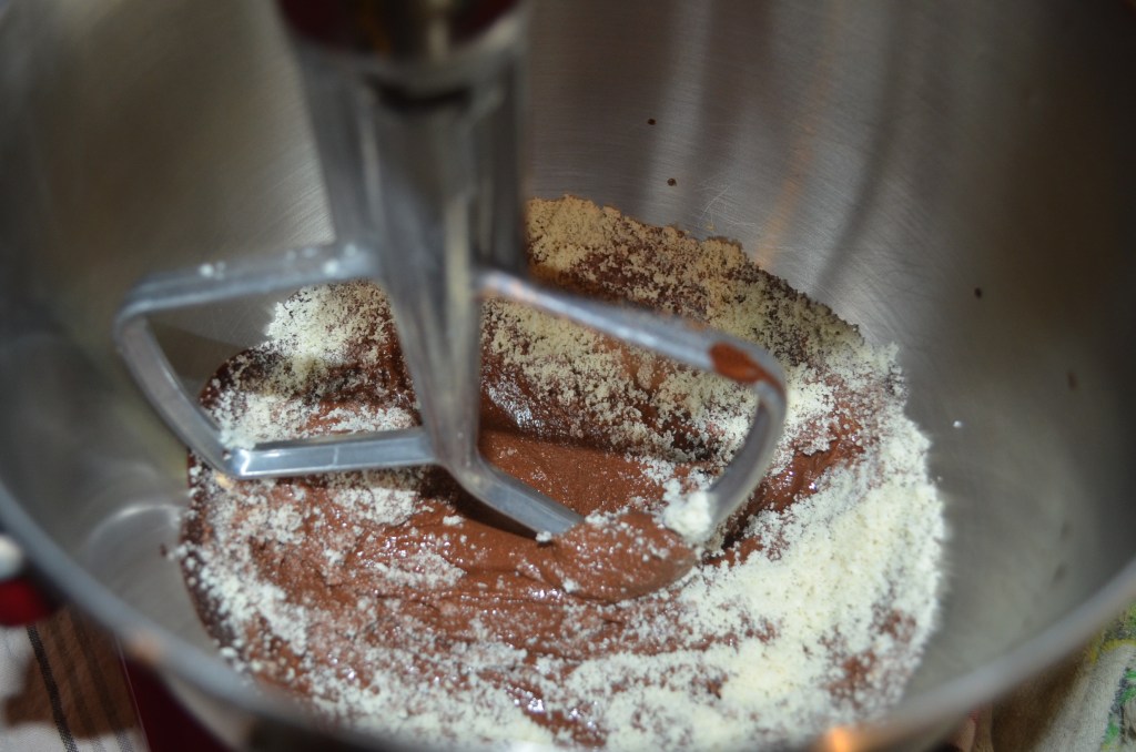 5. Then place the egg yolks and 1/2 cup (100 grams) of the granulated white sugar in the bowl of your electric mixer, fitted with the paddle attachment (can use a hand mixer). Beat the yolks and sugar until pale and thick (about 2 to 3 minutes). Beat in the melted chocolate mixture and vanilla extract. Fold in the ground almonds and salt.