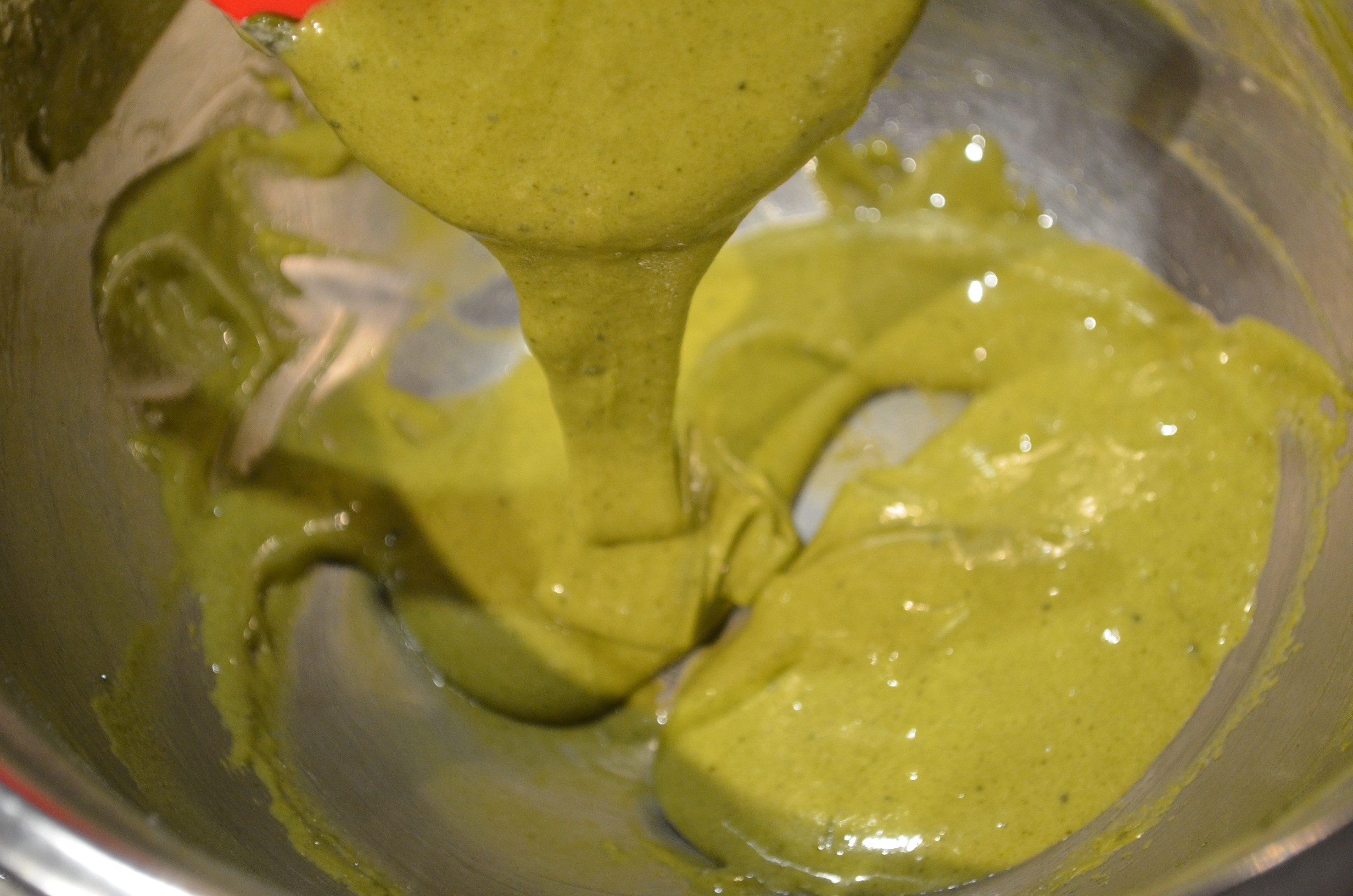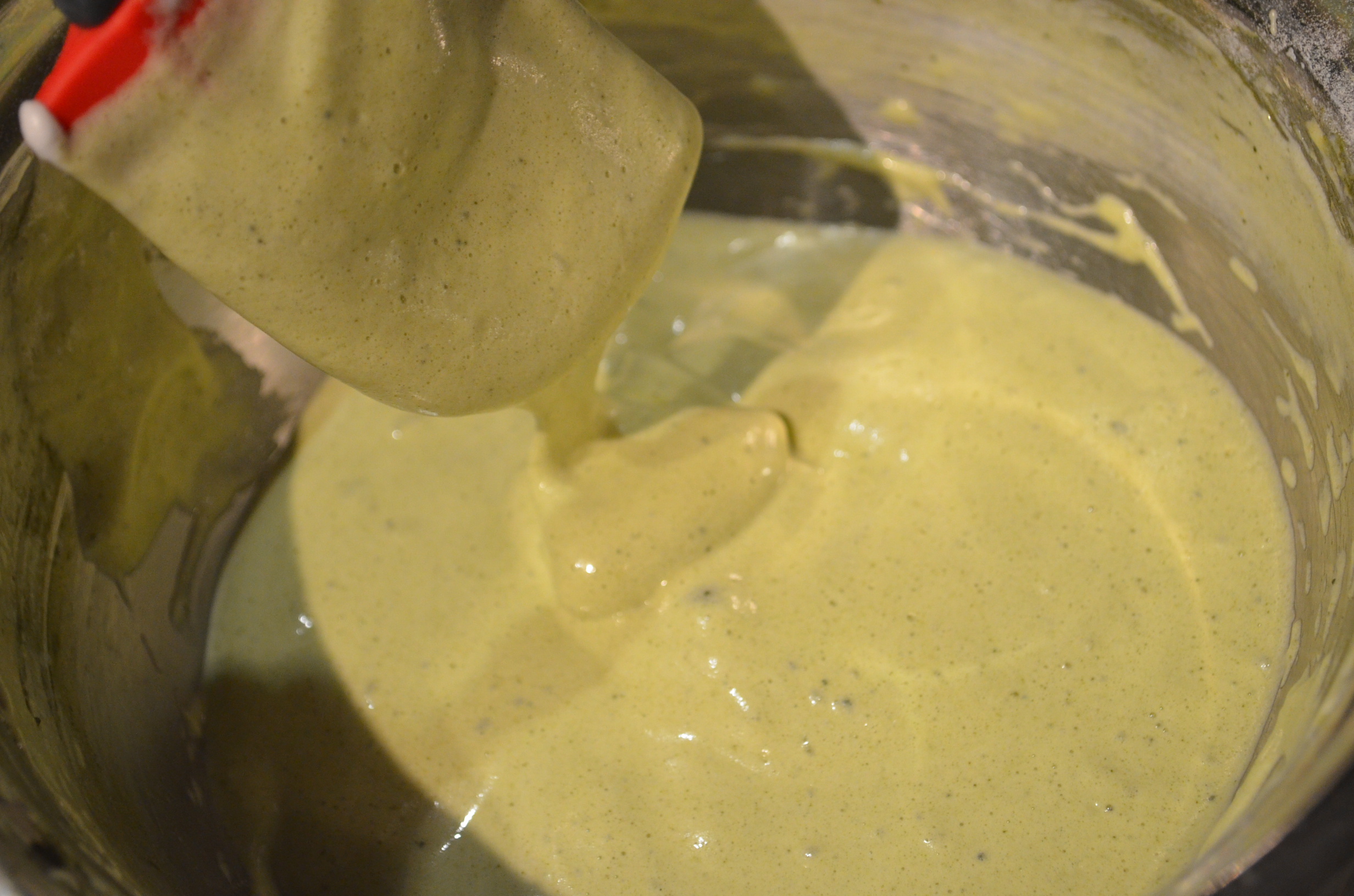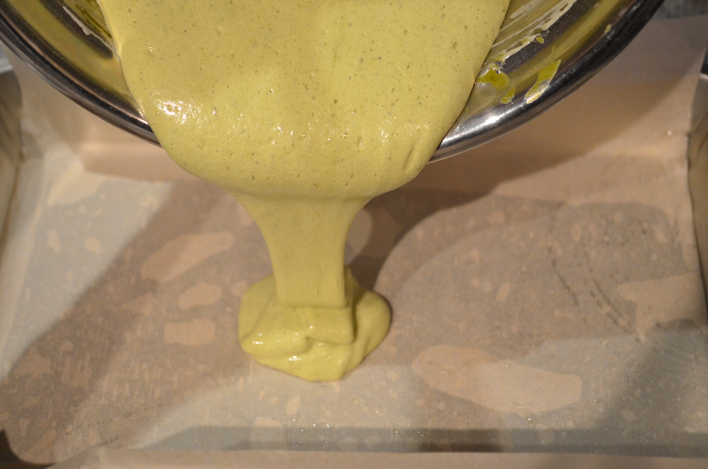 - Scrape batter into cake pan, slowly and from 1′ high. Spread as evenly as possible. Jiggle vigorously till batter is level, banging cake pan against work area 2-3 times.