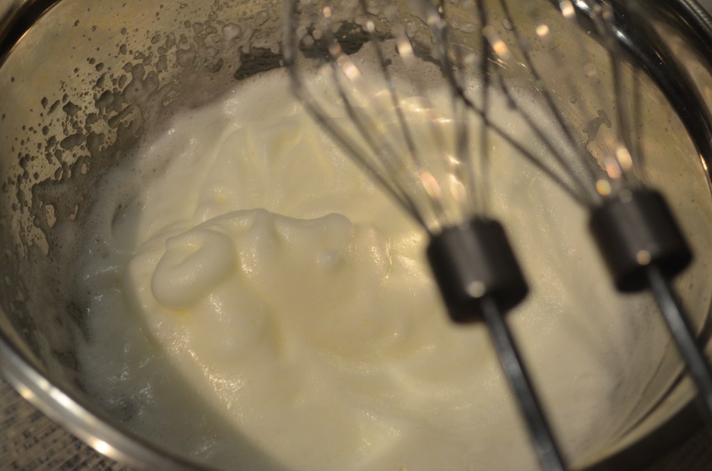 - Add egg yolks to egg whites in 4 batches. Manually whisk till evenly mixed after each addition. I do this manually to avoid deflating the egg whites too much.