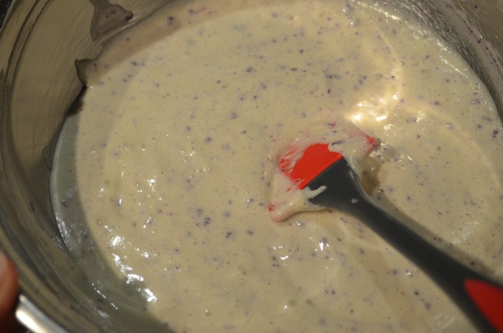 - Add 3 tbsp grated purple yam. Manually mix with whisk till almost even. Sift remaining cake flour into mixture. Mix with whisk till just even.