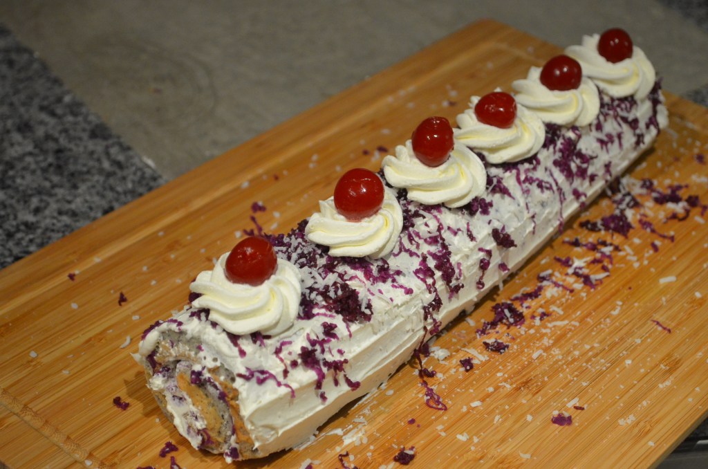 To cut Swiss roll neatly, dip serrated knife in hot water before each cut and wipe dry/clean with paper towel. For fruits and cream Swiss roll, chill till cream filling is set, then use a serrated knife that’s wiped clean after each cut.