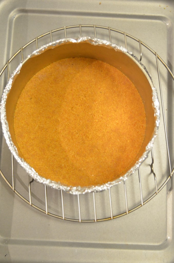 - Make the Graham Cracker Crust: Mix the graham cracker crumbs, melted butter, and granulated sugar together in a medium bowl until combined. Press into the bottom of the prepared pan (I used 6-inch springform pan) and only slightly up the sides. The crust will be thick. Wrap aluminum foil on the bottom and tightly around the outside walls of the springform pan, as shown in photos above. Bake the crust for 7 minutes. Allow to slightly cool as you prepare the filling.