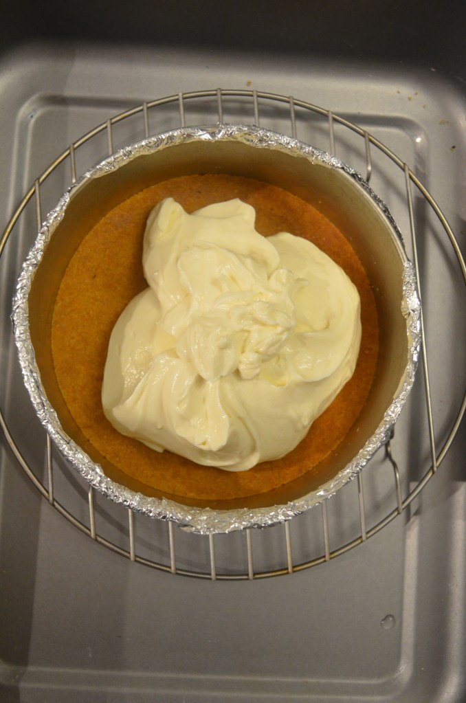 - If you are wondering why the pan is wrapped in foil and cooked in water bath, this is for even baking and to avoid crack top.