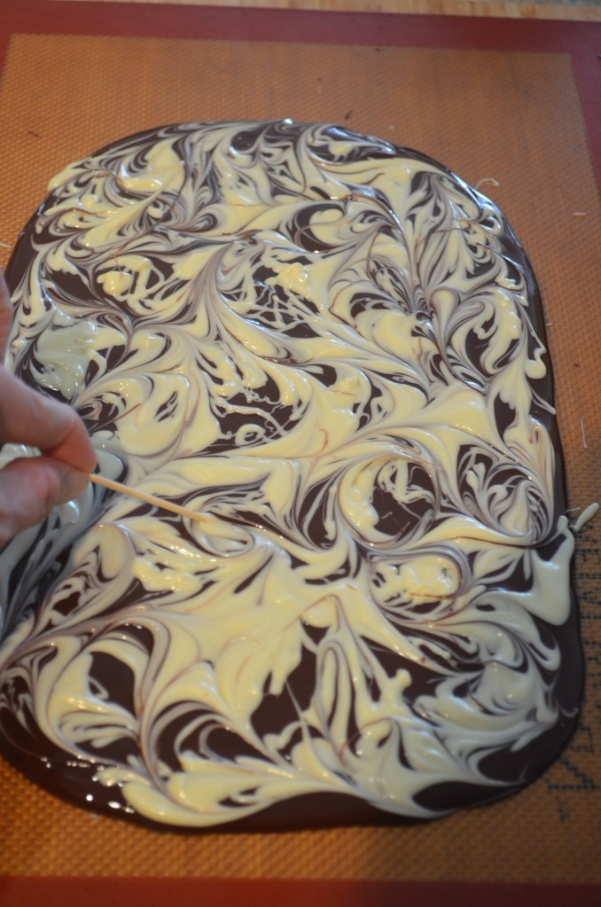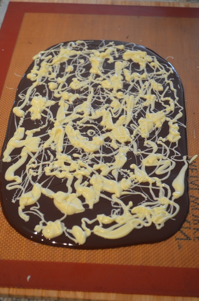 - Melt the semi-sweet/dark chocolate. Use a double boiler or microwave. If using the microwave, stop and stir the chocolate every 20 seconds to help avoid seizing. Pour onto prepared baking sheet and spread out into a large rectangle. Set aside and prepare the white chocolate.