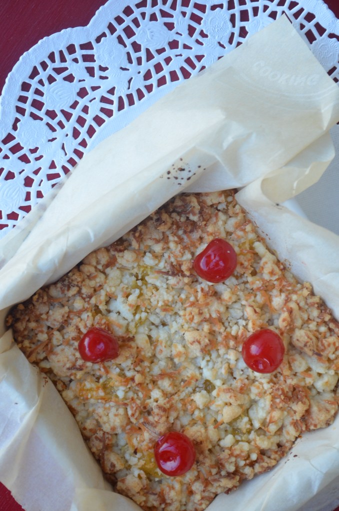 This crumb bar has a buttery and creamy base, like a shortbread. The center is filled with homemade pineapple filling with coconut bits and covered and topped with another layer of buttery and creamy crumbs with coconut. To seal the deal and to make it more summery and fun, I added some cherry on top. I used preserve cherry, but it would be even better if you use fresh cherry.