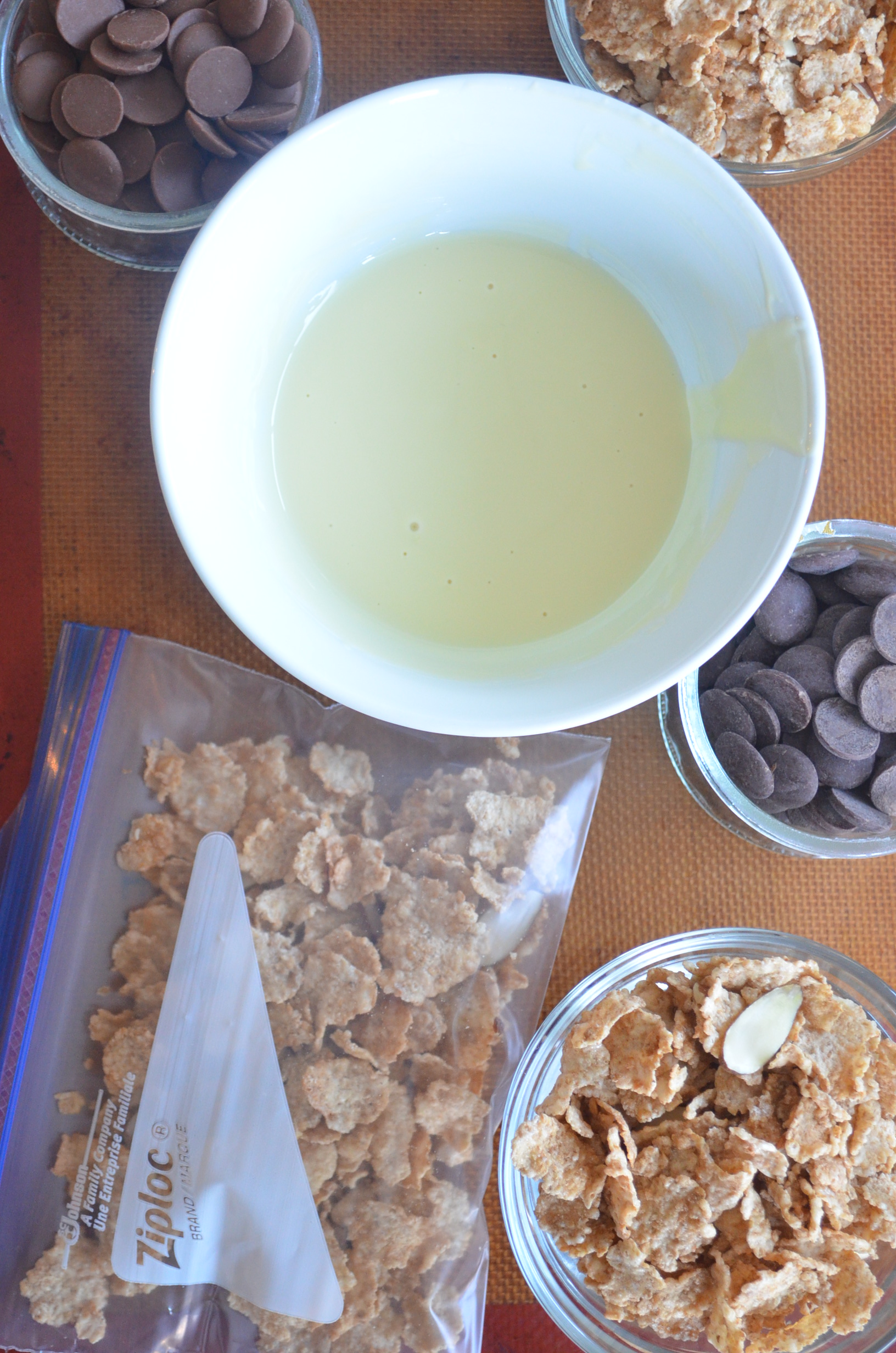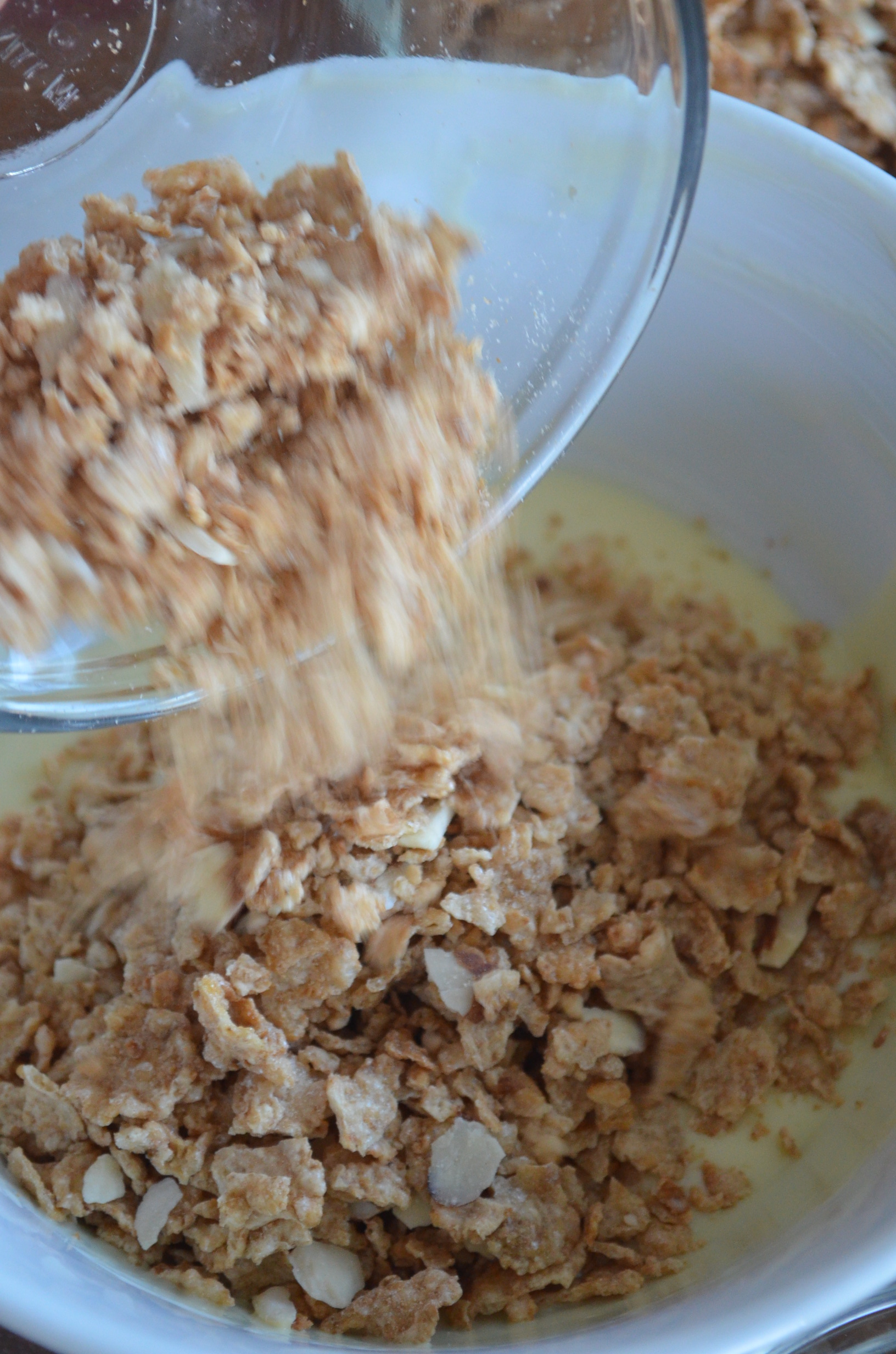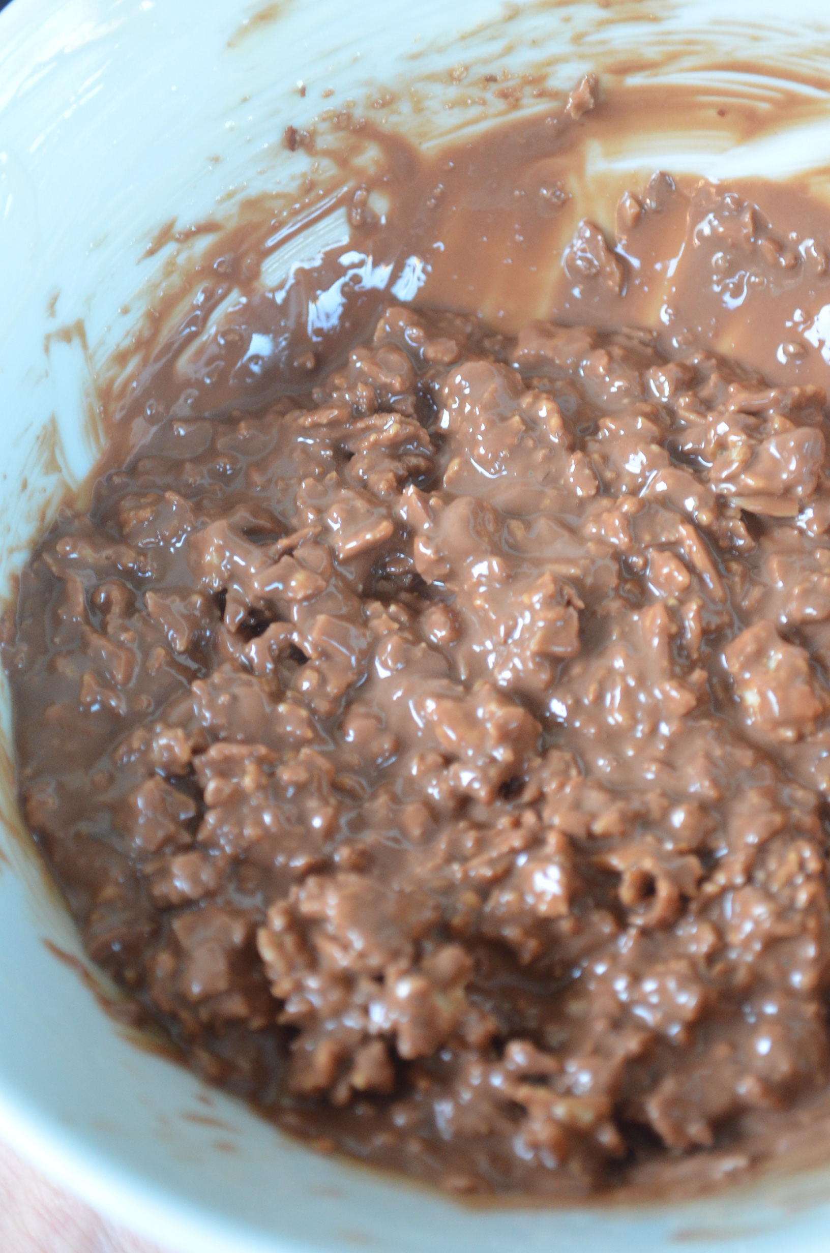 - Add the corn cereals to the melted chocolate and mix until cereals are fully covered with chocolates.