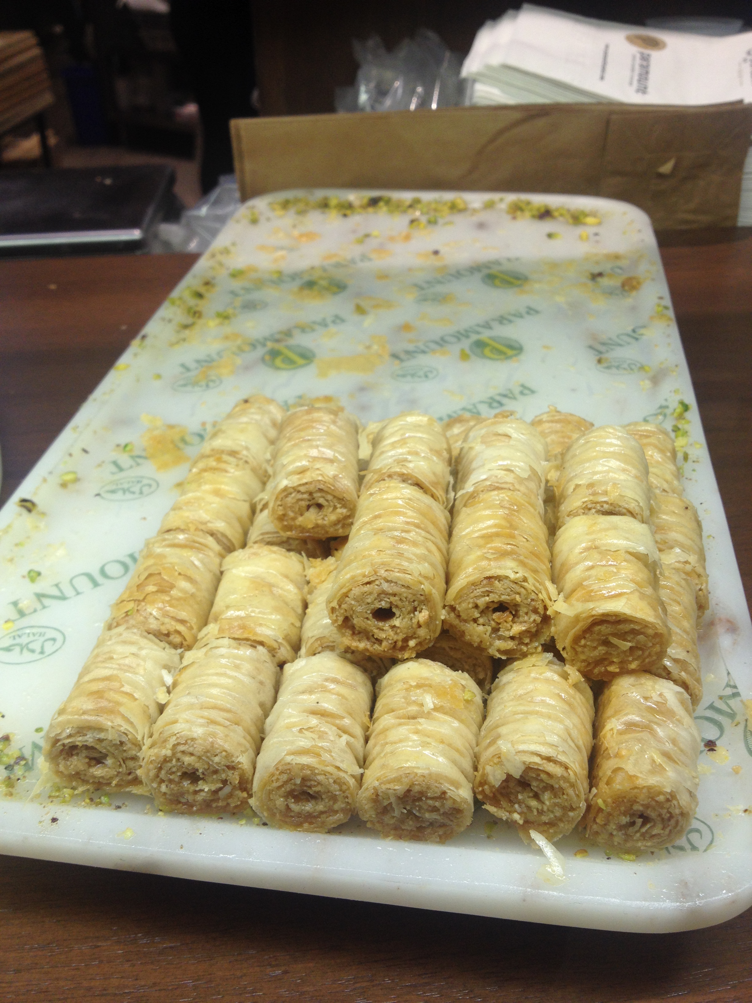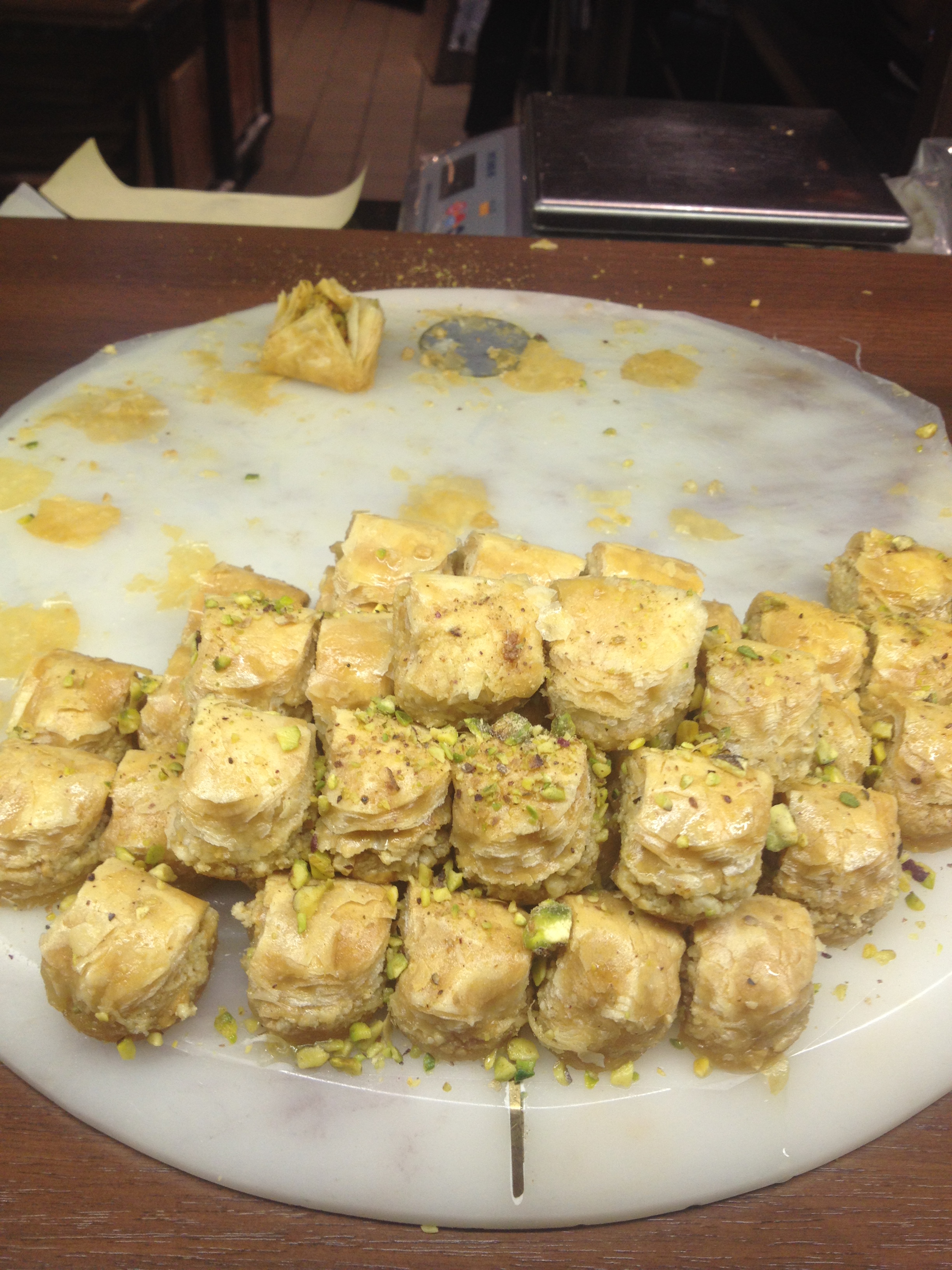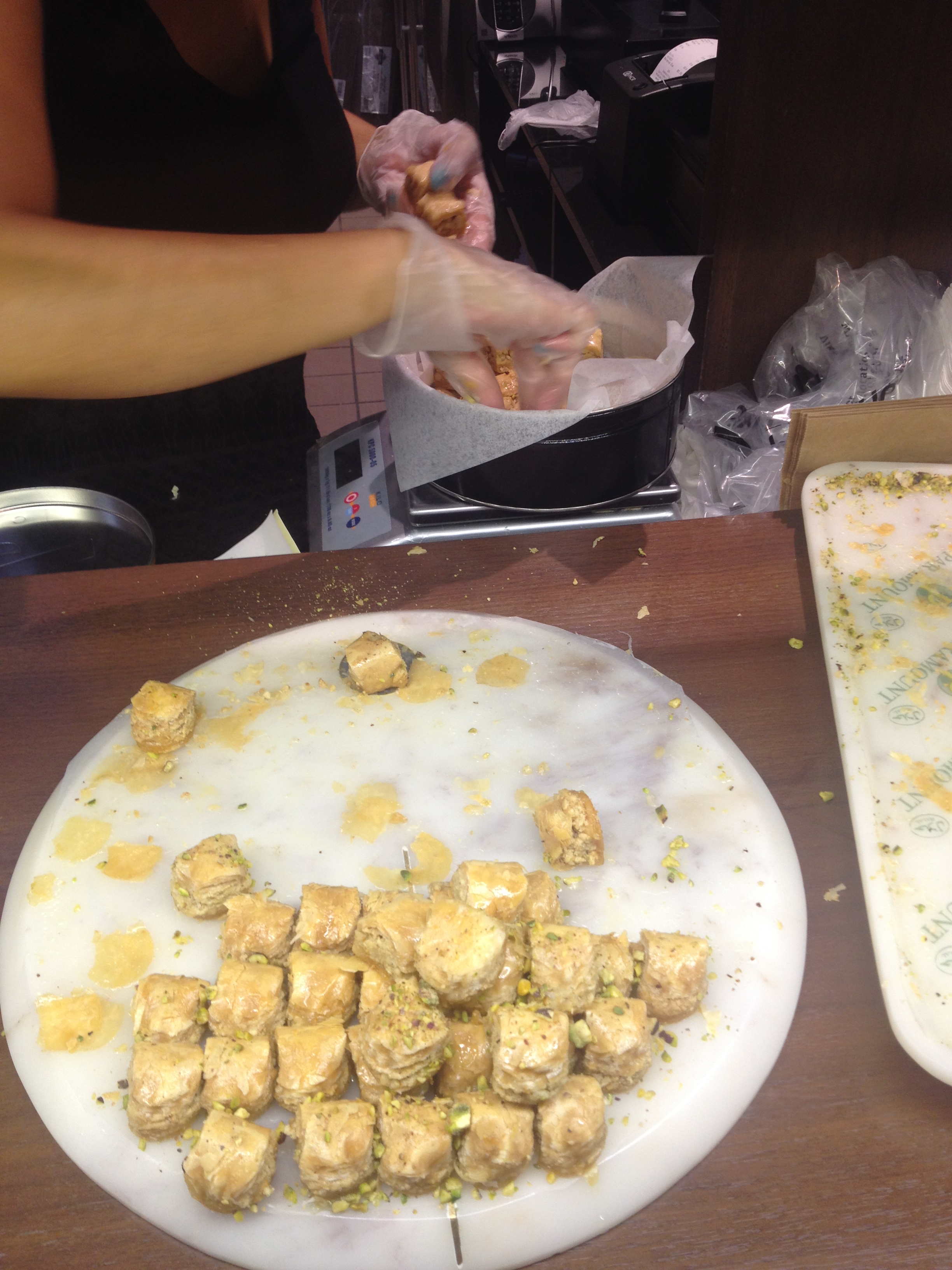 Kinafe: Lebanese or Nablseih kinafe drizzled with sugar syrup either served on plate, or inside a kaake bread.