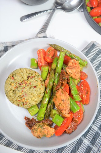 ‘Chicken with Asparagus and Tomato with Pesto Rice at SweetnSpicyLiving.com’