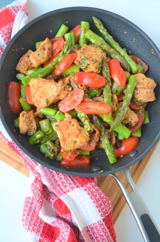‘One Pan Chicken Pesto with Asparagus and Tomato at SweetNSPicyLiving.com’