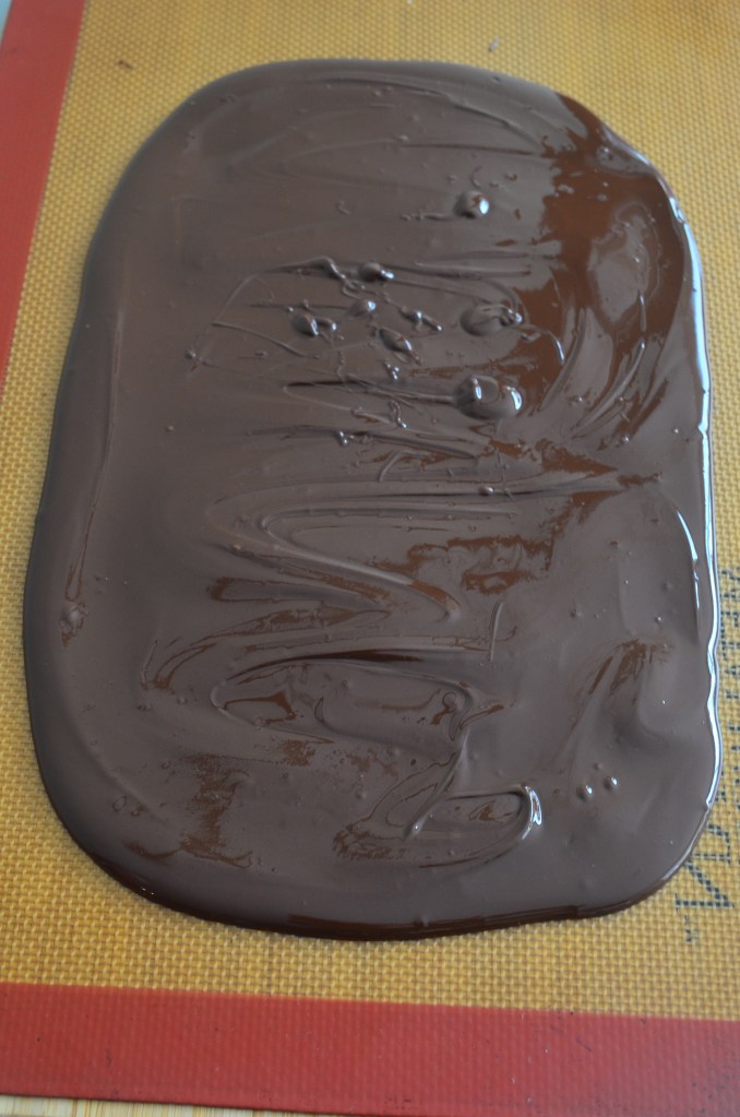 - Pour the melted chocolate onto the parchment. Use an offset spatula to spread it into a 9×13-inch rectangle.
