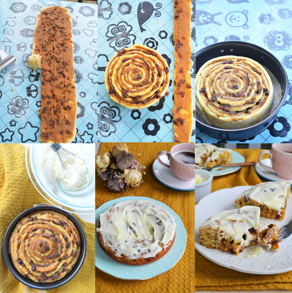 - Spread the cinnamon filling on top and sprinkle chopped raisins on top. Press the raisins so it sticks to the filling.