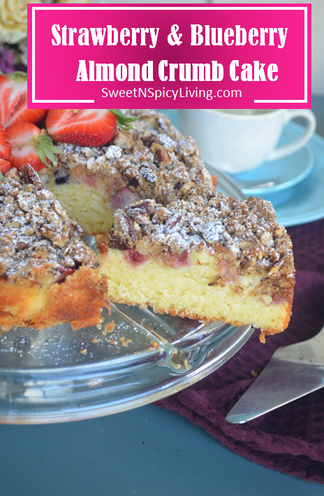 Cake for breakfast, why not? This Strawberry Almond Crumb Cake is absolutely delicious with a light crumb, soft and moist, and topped with fresh Strawberry and Blueberry and crunchy crumble toppings. It’s time to bring out your coffee or tea.