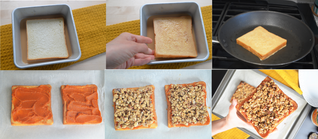 - Toast the Bread: Spray a heated non-stick pan with oil or grease with butter. Do NOT put a lot of oil or butter and make sure the pan is hot before putting down the bread. Cook each side of the bread for 5 minutes in medium heat. This will help the bread to have a nice crunchy stable bottom. Very carefully lift away from the pan and transfer in a parchment lined baking pan.