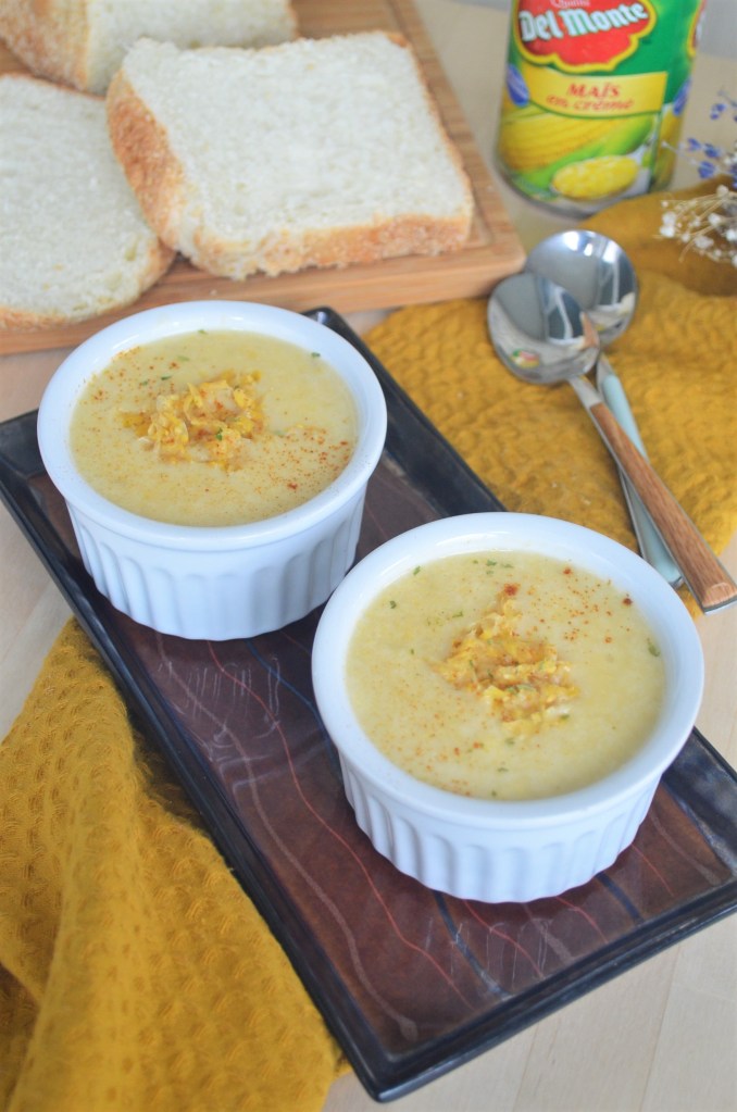 Start by sautéing the onion in butter until translucent. Add flour and mix to combine. The flour will serve as thickener for the soup. Some recipe do not use onion, but I find it gives a nice taste to the soup. After this, simply add cream of corn, broth, milk, salt and pepper. Summer for 5 minutes while stirring from time to time. The consistency will get thicker. At this point, if you like a chunky soup with bits and pieces of corn, you can stop at this stage. If you want it creamy, transfer it in a blender and blend until smooth and creamy. You can also use an immersion blender if you have one. I like to return it back to the pan to summer addition al 1 minute, its also a good chance to season it if needed. That’s about it. Serve with with croutons on top of serve it as is.