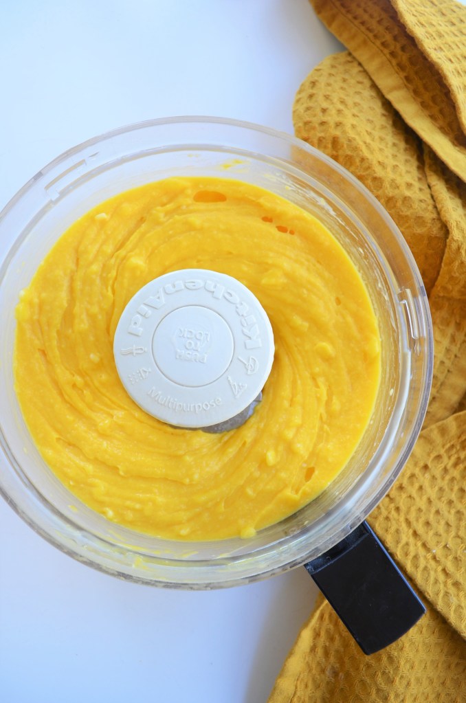 - Blend it Up: Add the frozen Mango, yogurt, and condensed milk into a food processor or blender. Process or blend until creamy, about 3-5 minutes. Scrape down the side as needed to make sure there are no chunks of Mango left.