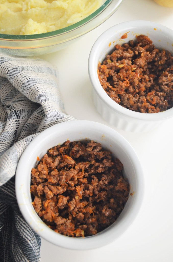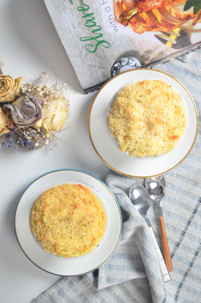 Bake: Once you’re done with the minced meat mixture and the mashed potato, the only thing left is to transfer it in a baking dish and bake. I used 2 4-inch ramekins but this can be divided into 3 portions especially if you are serving this with another dish. You can also bake this in a single baking, something deeper so that you get a nice thick serving. Grate some cheese on top for additional texture, and besides who doesn’t love cheese anyway. But you can totally skip it, it is totally up to you.