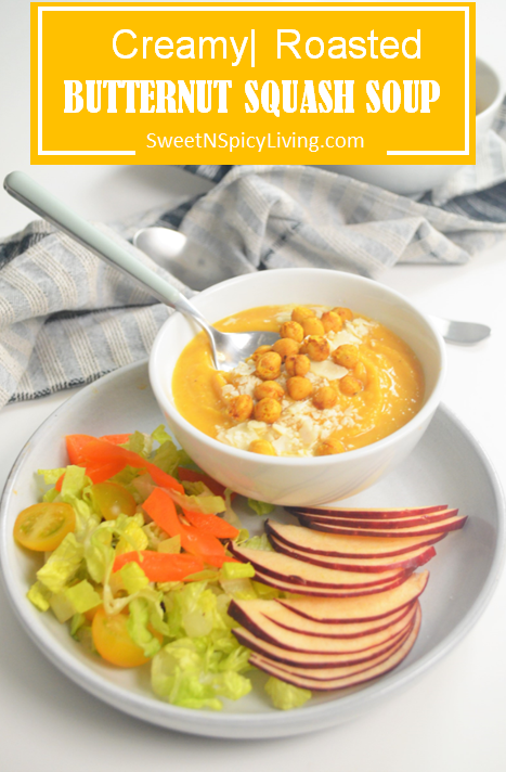 This Roasted Butternut Squash Soup is thick and creamy, so dreamy, warm and delicious. Serve it on its own or garnish it with some Toasted Chickpea and some Parmesan cheese on top and a side of fresh fruits and a bowl of salad.