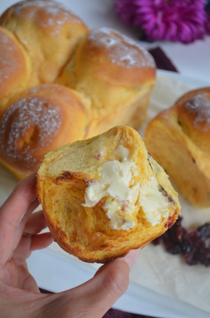 This variation was inspired by the Sweet Potato Rolls I shared last year. In fact, it is almost the same recipe but with the addition of dried Cranberry. Small twist but it makes a huge of difference in taste and texture. The Cranberry added a nice texture to this soft bread, and a tangy citrus bits and pieces. Reminds me raisins bread. Cranberry have a stronger tangy flavor than raisins, not as sweet as raisins but it taste good in different way. You can definitely substitute raisins if you do not have Cranberry.