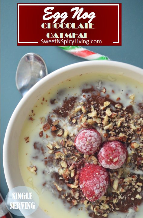Last but not the least, my holiday themed oatmeal. This Cranberry and Pecan Eggnog Oatmeal is very festive and truly a nice warm way to wake up in the morning. Make the most of the eggnog and make this Eggnog oatmeal