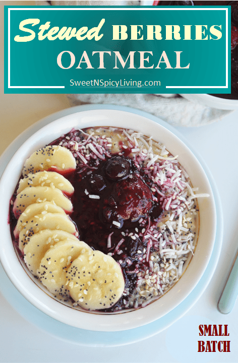 Quick and easy breakfast oatmeal topped with Stewed Berries. No need to worry even if Berries are not in season. Stewed Berries can be made using either fresh of frozen mix Berries and can be sweetened with any sweetener of your choice. You can use it not only for oatmeal. Think about toppings for ice cream or sundae, pancake, waffle and french toast. Oatmeal is just the start, a delicious start if I may stress.