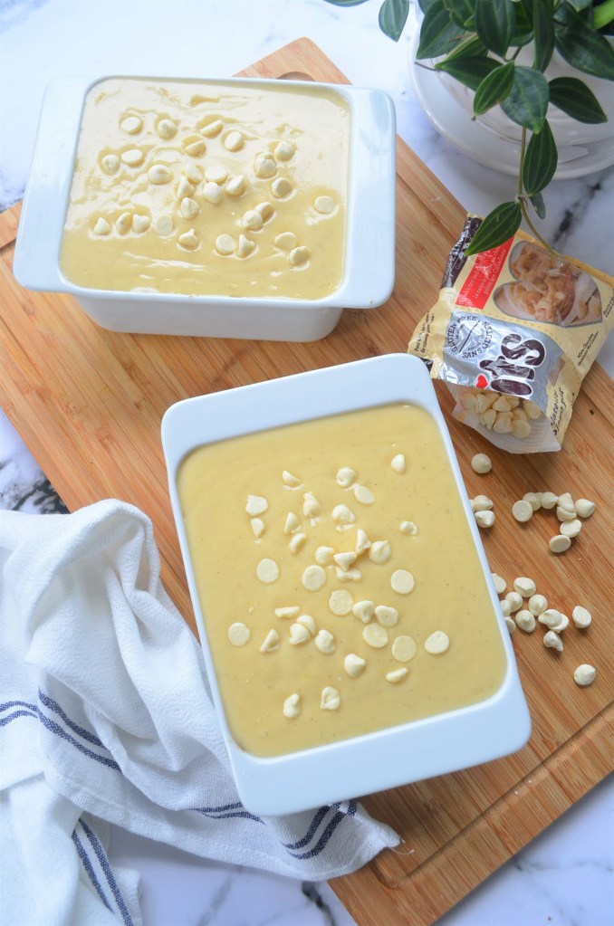 - Make the Cardamom Custard: Pour the custard between 2 cakes. Do this while the custard is still warm for easy spreading. Sprinkle with white chocolate chips or chopped white chocolate or combination of both.