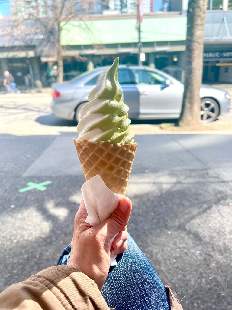 After sitting for a long time, I wanted to stretch a bit and do some walking. I walked down Robson a street which the heart of shipping district in Downtown Vancouver. I walked aimlessly, no specific place to go, wherever the road takes me. Guess where I ended? I am please where my walk took me, to Bon Crepe. This is a small Japanese store that sells usual Japanese items and snacks, plus soft serve ice cream, sundae and crepes. I still feel full from breakfast. I did not mention that I ate the Pistachio Raspberry Croissant while sitting on the bench and soaking up the warmth of the sun. I just want something cold, so I got the Waffle Cone Vanilla & Matcha Swirl. I sat outside while I finish my soft serve, it was indeed a chill day for me.