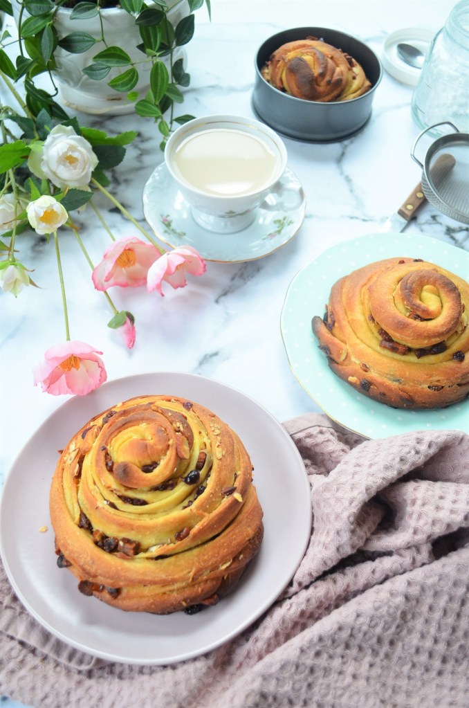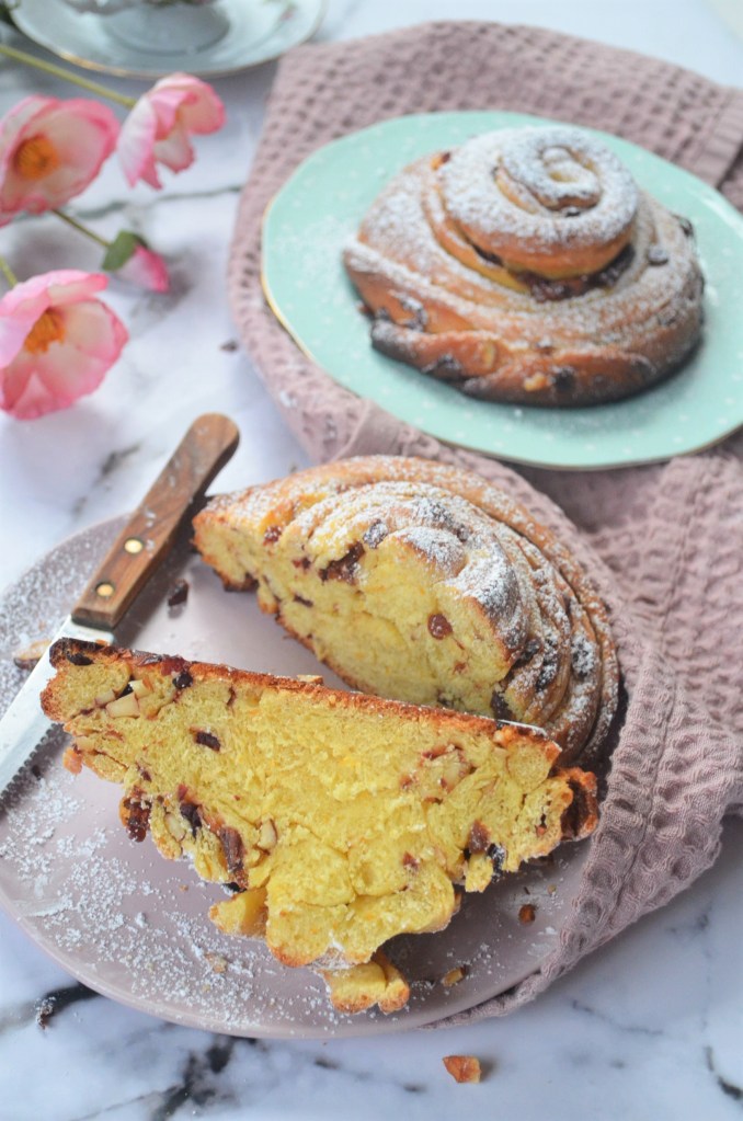 For this method, cut the dough into two portions. Cover the other dough with towel while you work with the other one. Roll and flatten the dough and fill with desired filling. Roll into a log then cut into half lengthwise, this will expose the layers of the rolled strip. Use one strip and roll side ways, layers side facing out. The first strip will be the base. Use the second strip to continue the curling. If you want a taller Kulich, instead of rolling the second strip on the side, connect it to the end of the first strip and then curl it on top of the base dough. This is like creating a second layer of dough on top to create a taller bread. Wide or tall, the choice is yours. Both taste great 🙂