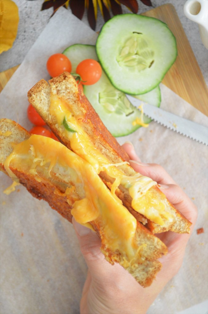 Grilled Cheese! But not just any regular grilled cheese. This grilled cheese if loaded with cheese inside and out. The outside is crunchy with toasted cheese spread on top, while the inside is oozing with cheese and sliced jalapeño peppers. I like my grilled cheese with slight kick of heat, but if you’d one, simply reduce the amount or completely skip it. It’s your grilled cheese after all, do as you please.