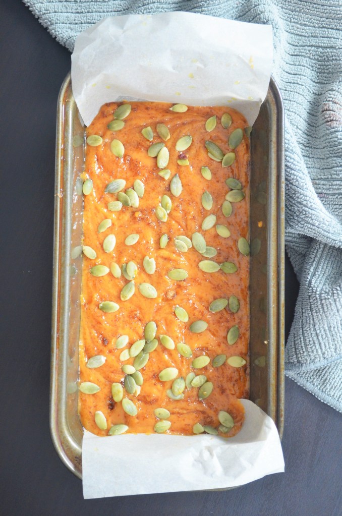 - Add Topping: Sprinkle brown sugar on top then use a toothpick or end of a knife to gently swirl the batter just to slightly incorporate the brown sugar. Sprinkle pumpkin seeds on top. Push the pan back and forth to even the top of the batter.