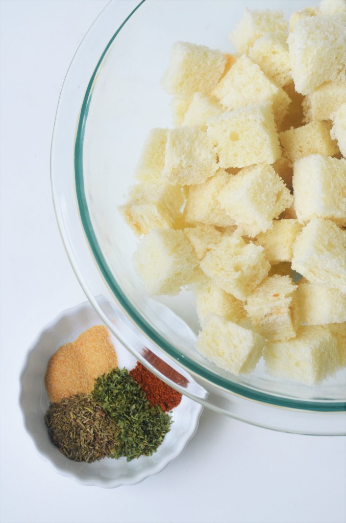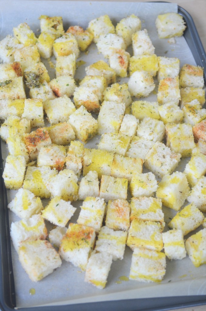- Bread – Old bread is suggested. Fresh bread will take longer to bake as it is still very soft. You want a drier bread to make croutons
