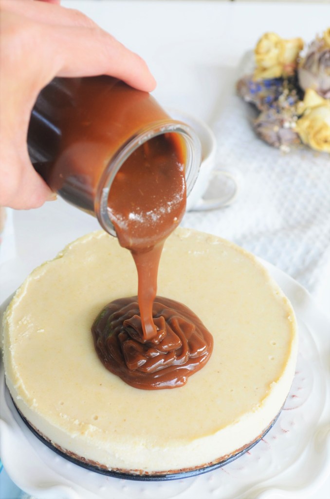 - Pour the caramel sauce: If the caramel sauce has harden a bit (which is normal), microwave it for 20 – 30 seconds until smooth. Pour the salted caramel sauce on top, pouring on the center to allow it to spread on top. Use an spatula to completely cover the top and push a little bit over the edges. You can use more or less caramel sauce as you like.