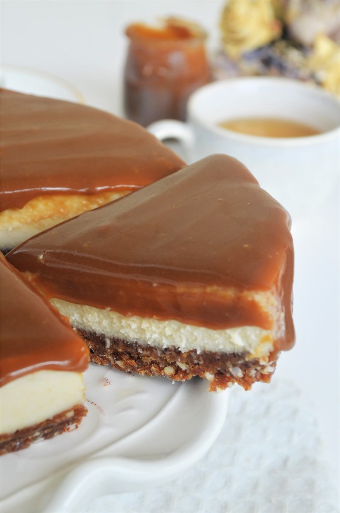 Feeling like having a cheesecake without all the dairy in it? This is the one that you are looking for. A dairy free, grain free and gluten free creamy Caramel Cheesecake. 3 delicious layers starting from a crust made with mainly nuts and dates, a filling made from raw cashew and a salted caramel topping made with coconut cream and coconut/palm sugar. All delicious simple ingredients in every bite but with less fat and calories of a traditional cheesecake. Sometimes we just want to indulge and not suffer the consequences of eating a slice or 2.