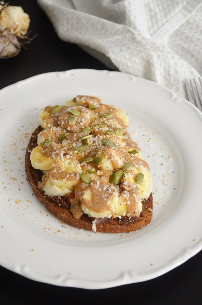 You can also combine it with other spread,like any nut butter. For this one, I topped it with sliced Banana, almond butter, dessicated coconut and pumpkin seeds.