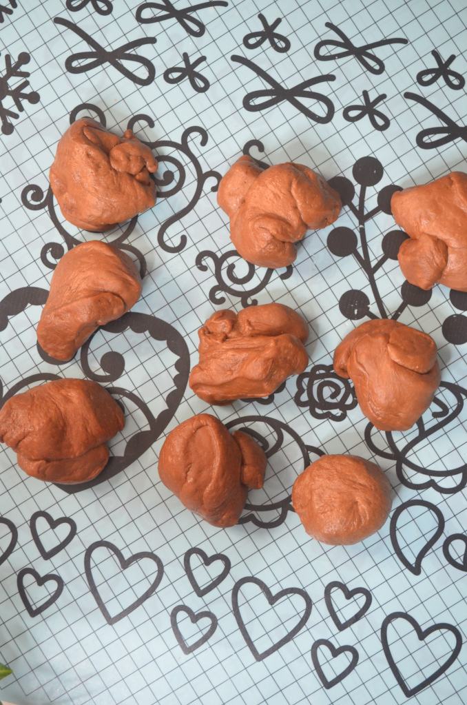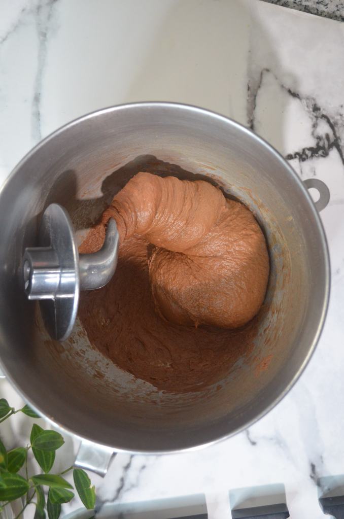Knead: To the yeast, add bread flour, sugar, cocoa powder, salt, melted chocolate and egg. Knead for 15 minutes until the dough is soft and well combined. If the dough is too wet, add 1/2 – 1 tablespoon extra bread flour.