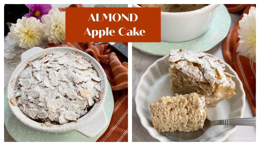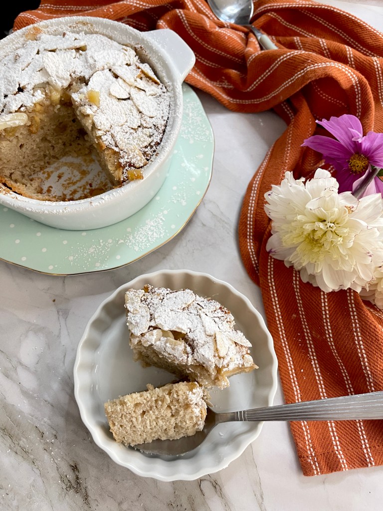 What could be a better help to embraced Fall than with a nice warm soft Almond Apple Cake topped with caramelized apple and crunchy bits of sliced almonds.