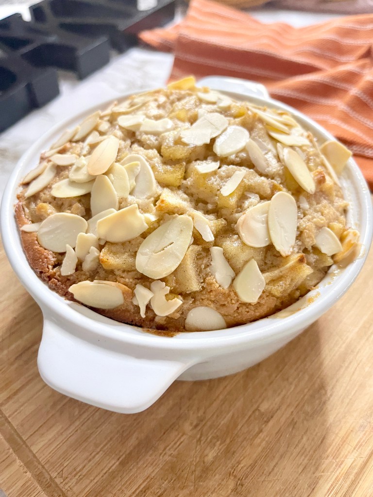 - Transfer in a 6-inch baking pan. Top with the caramelized apple and slightly mix in a swirl motion. Top with sliced almonds.
