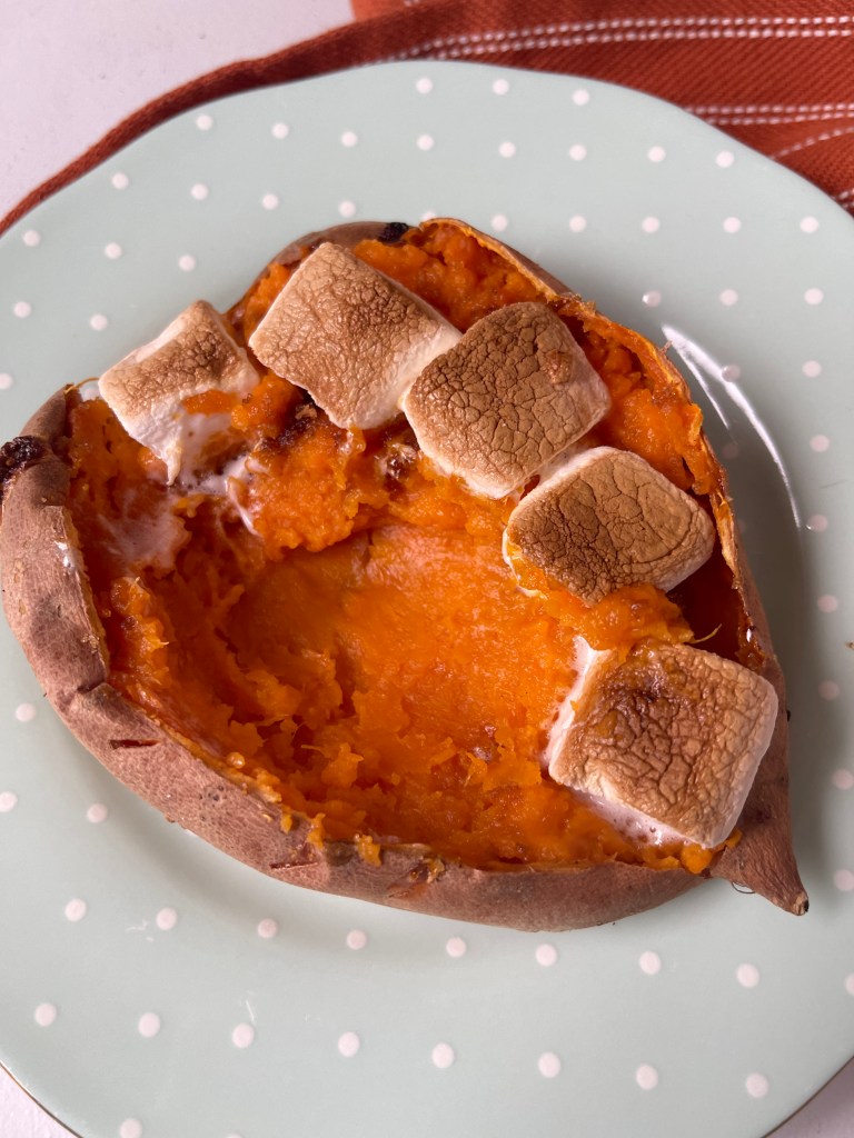 - Add marshmallow on top. If you scooped out the mash potato and use the food processor, scoop it back to the skin shell or transfer it in a baking dish. For this recipe, I kept everything in the sweet potato skin. I personally like the appeal for single serving.