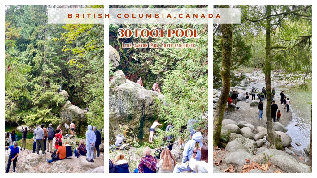 Last but not the least, the 30 foot pool. The 30 Foot Pool is on route to the Pipe Bridge which crosses the canyon and leads to the top of Lynn Valley Road. If the Pipe Bridge is where you are headed, be prepared for a long climb up a wooden stairwell to the top of the canyon. There is a lookout point on the stairwell with a great view of the 30 Foot Pool and surrounding area. Watch the short video to see a guy cliff jumping to the 30 foot pool.