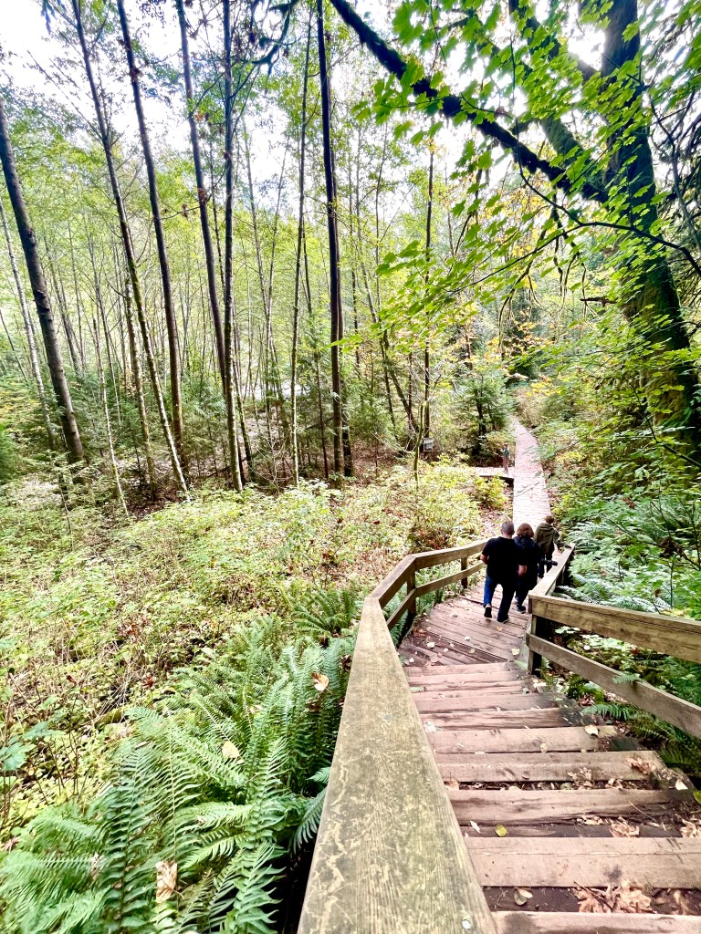 It is about 15 minutes walk with some going up and down the stairs. This area is not as crowded as the suspension bridge and a great stop to explore. Walk onto the short bridge and enjoy the view of the falls below. After you have enjoyed the area, make your way back to the wooden bridge above Twin Falls and cross to the other side and continue enjoying the hike.
