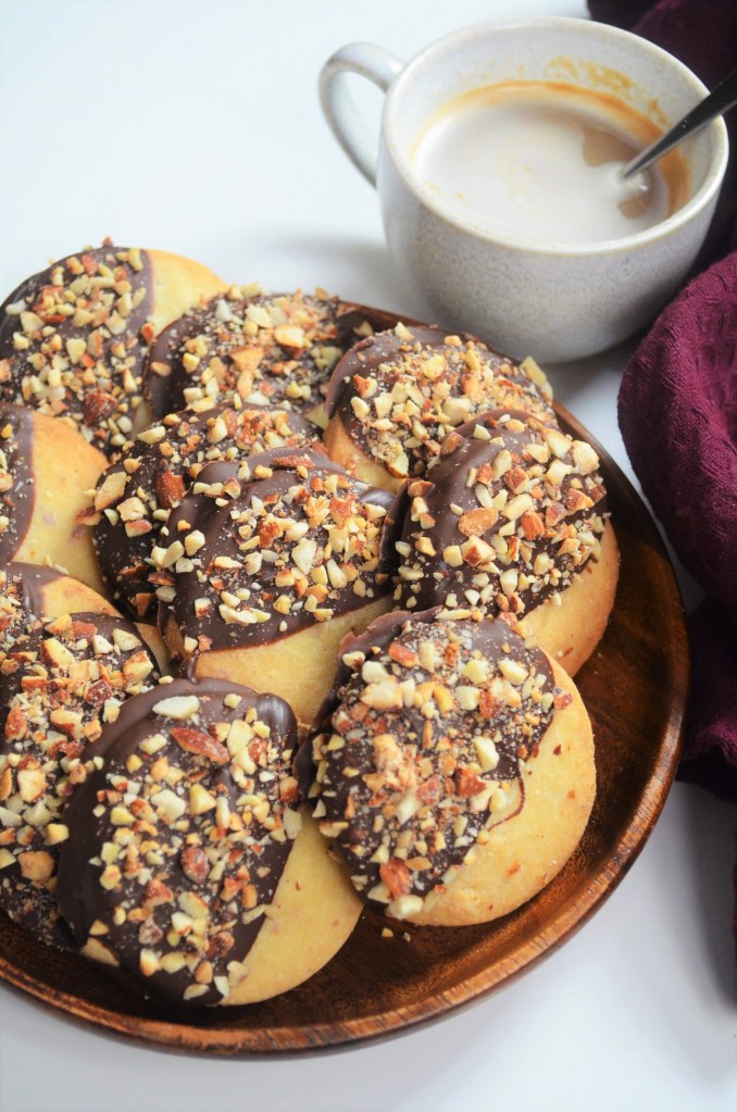 Shortbread Cookie makes me speechless, I cannot even describe how I am head over heels in love with this cookie. I made more than 10 variations of this cookie and I still cannot stop making more. Today’s variation is Creamy Chocolate Dipped Shortbread Cookie with Nuts. It uses my go to creamy and buttery shortbread cookie, plus melted dark chocolate and a generous amount of toasted Almonds that gave the cookie texture and crunch