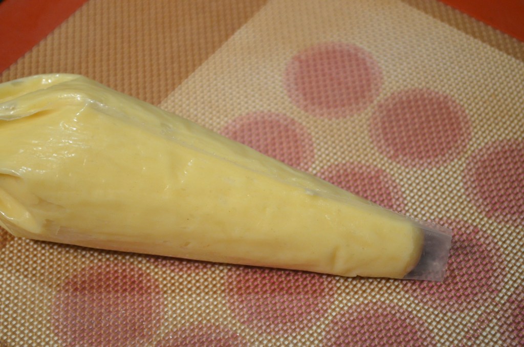 - Fill the piping bag with filling of your choice. I used Custard Pastry Cream. Check out my video to see how I made it.