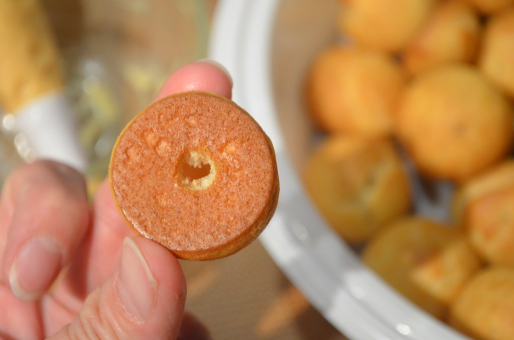 - Insert the tip of the piping bag in the small hole and squeeze to let the filling out.