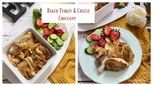 Croissant bake is one easy way to make a breakfast out of a croissant. You can make it the same day and even make it overnight for baking the following morning. Start by cutting the croissant into small pieces. Insert pieces of turkey and cheese in between and soak in custard. Bake at 350F for 10 – 15 minutes or until the egg is set and the cheese is melted.