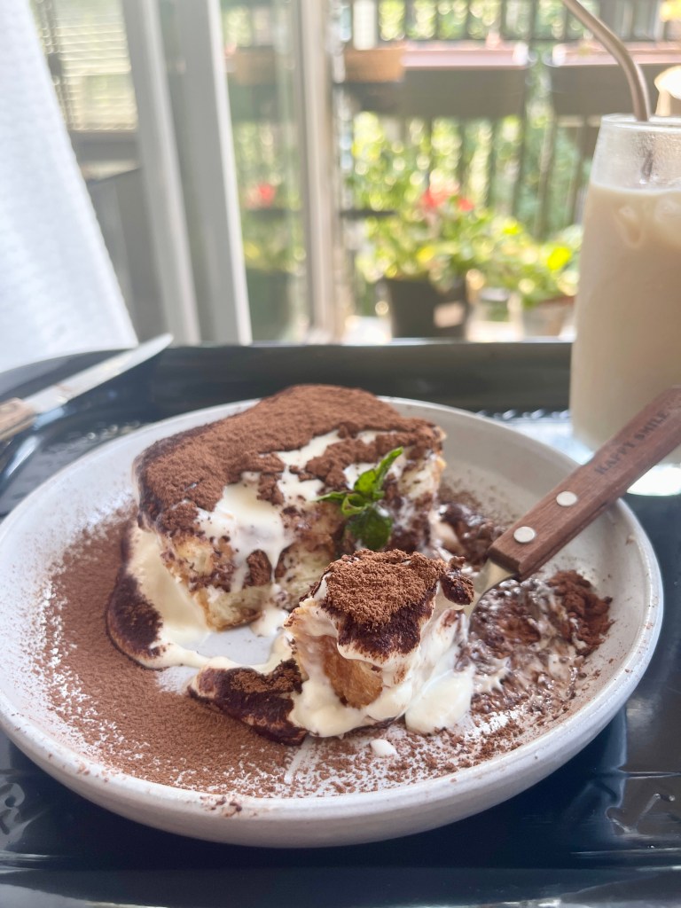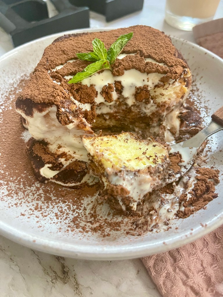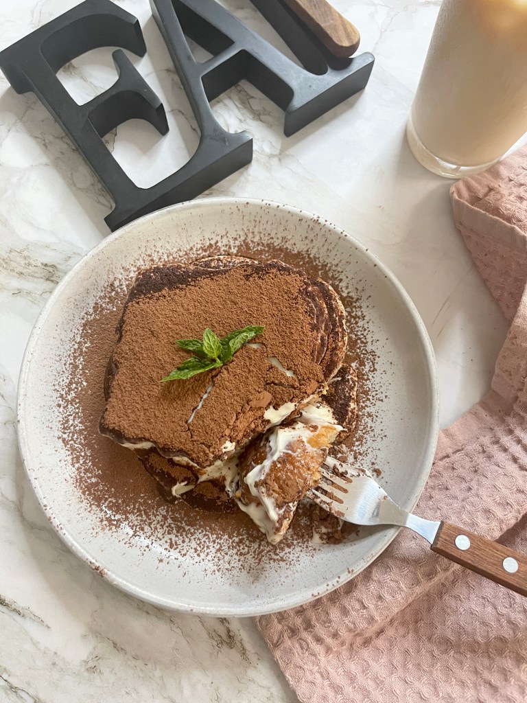 Once done, you can pour the mascarpone cream on top. Be generous, go ahead and pour. The mascarpone cream is more than enough to make 2 or maybe 3 French toast depending on how generous you want to be. A dusting of cocoa powder on top to give it the Tiramisu look 🙂