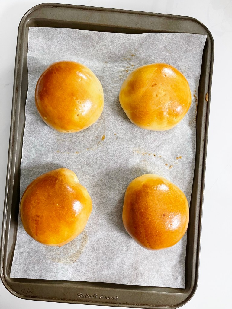 Divide your dough into four portions, flatten each piece, and spoon in a generous amount of filling. Seal the edges tightly, and give the buns a quick proof before they hit the oven. Just ike that!