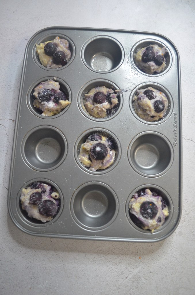 3. Scoop in the prepared muffin tin. Press more Blueberry on top and sprinkle granulated sugar on top.